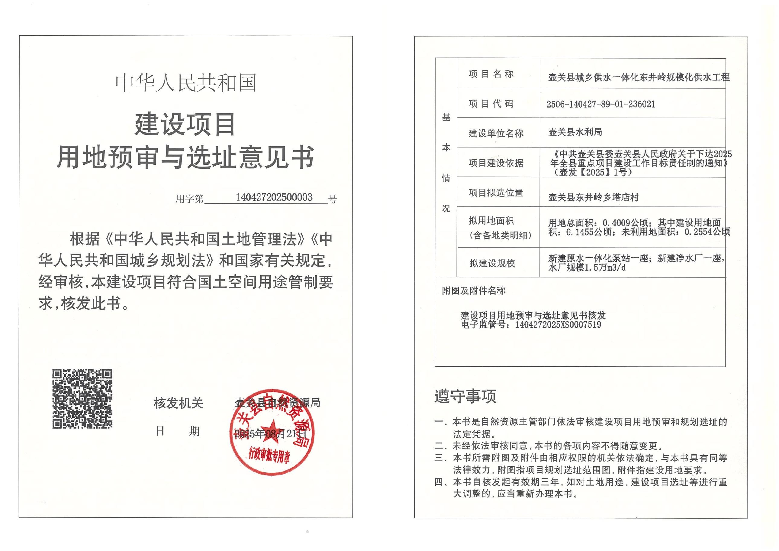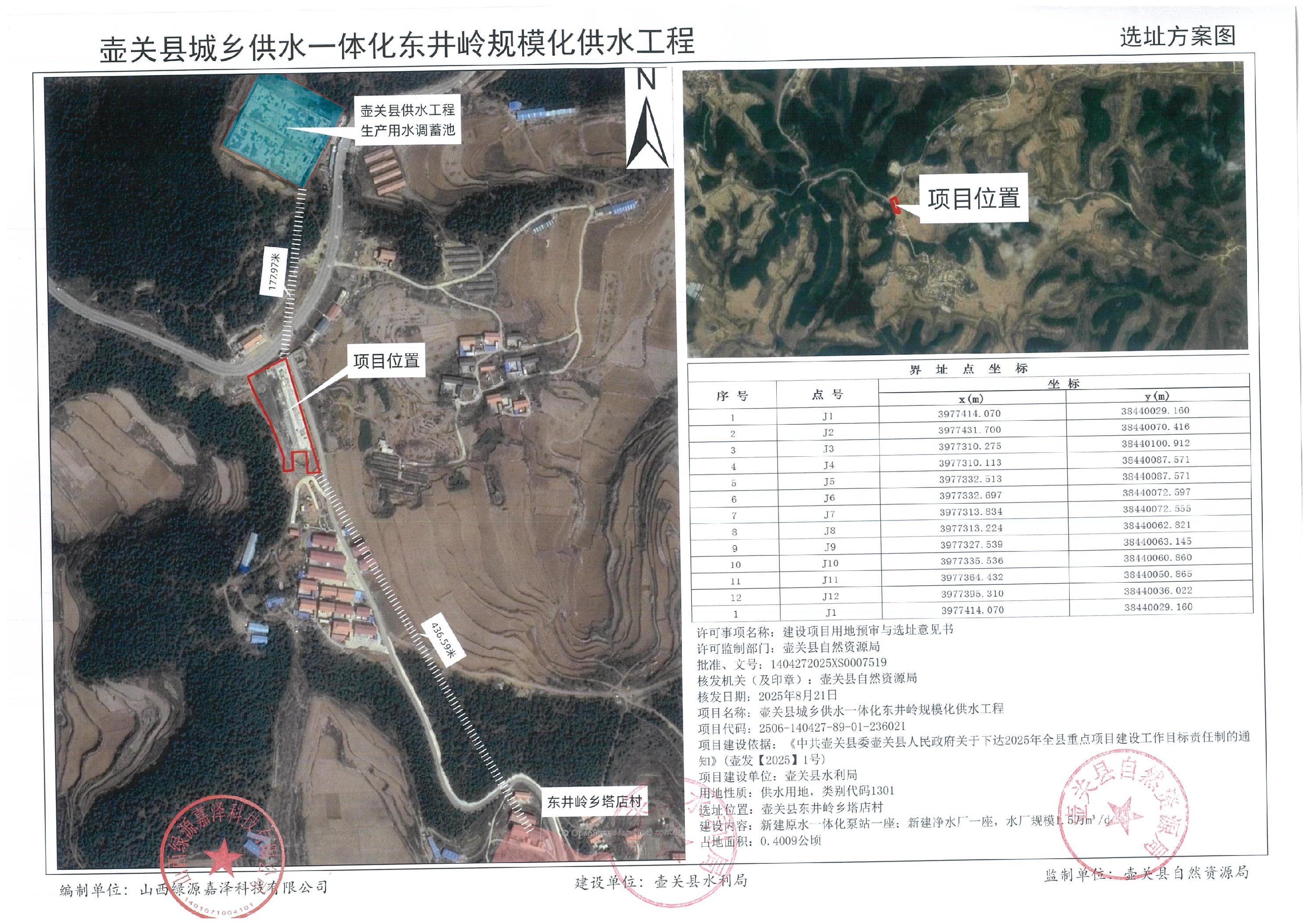 壺關縣城鄉供水一體化東井嶺規模化供水工程選址方案圖、建設項目用地預審與選址意見書