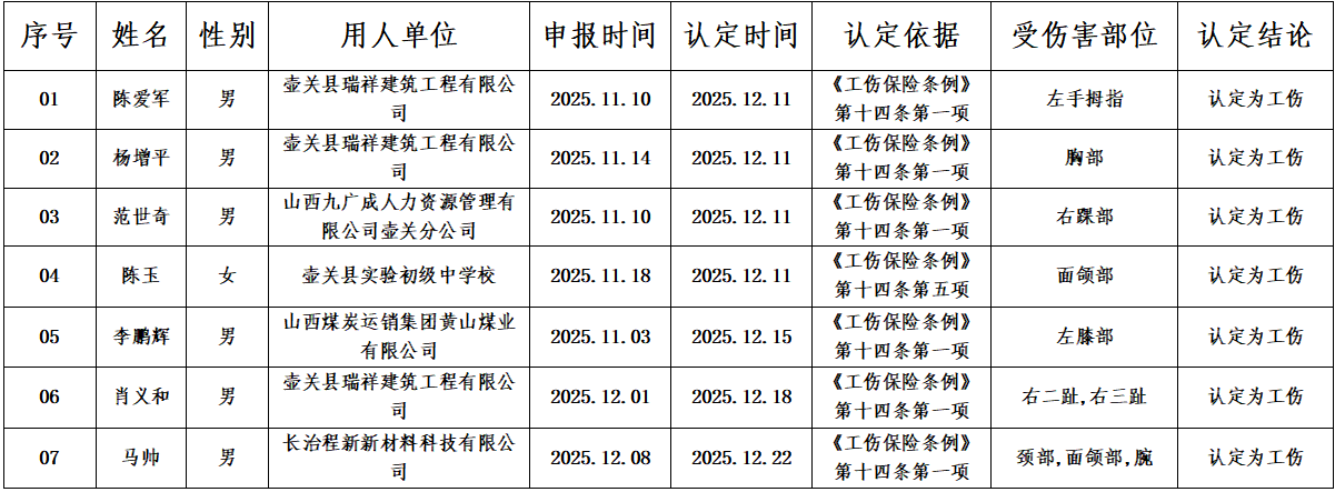 根據《工傷保險條例》等有關規定,現將壺關縣人力資源和社會保障局2025年12月作出的工傷認定決定予以公示,并接受社會監督。公示期為9天,公示時間為2026年1月4日至2026年1月12日。如對認定結果有異議,請向壺關縣人力資源和社會保障局反映。壺關縣人力資源和社會保障局將嚴格為提供線索和材料的人員保密。
