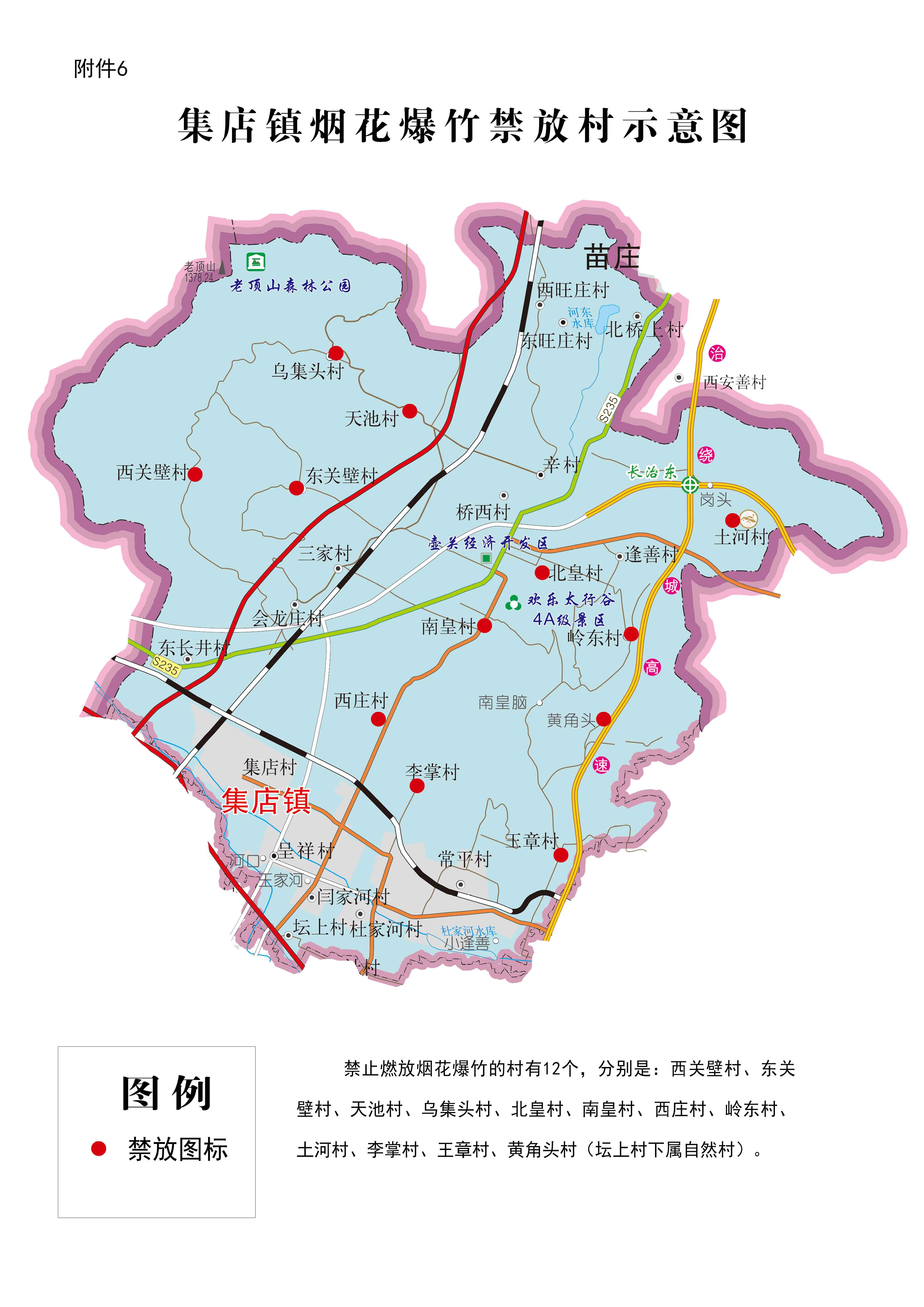 集店鎮禁放范圍:西關壁村、東關壁村、天池村、烏集頭村、北皇村、南皇村、西莊村、嶺東村、土河村、李掌村、王章村、黃角頭村(壇上村下屬自然村)。